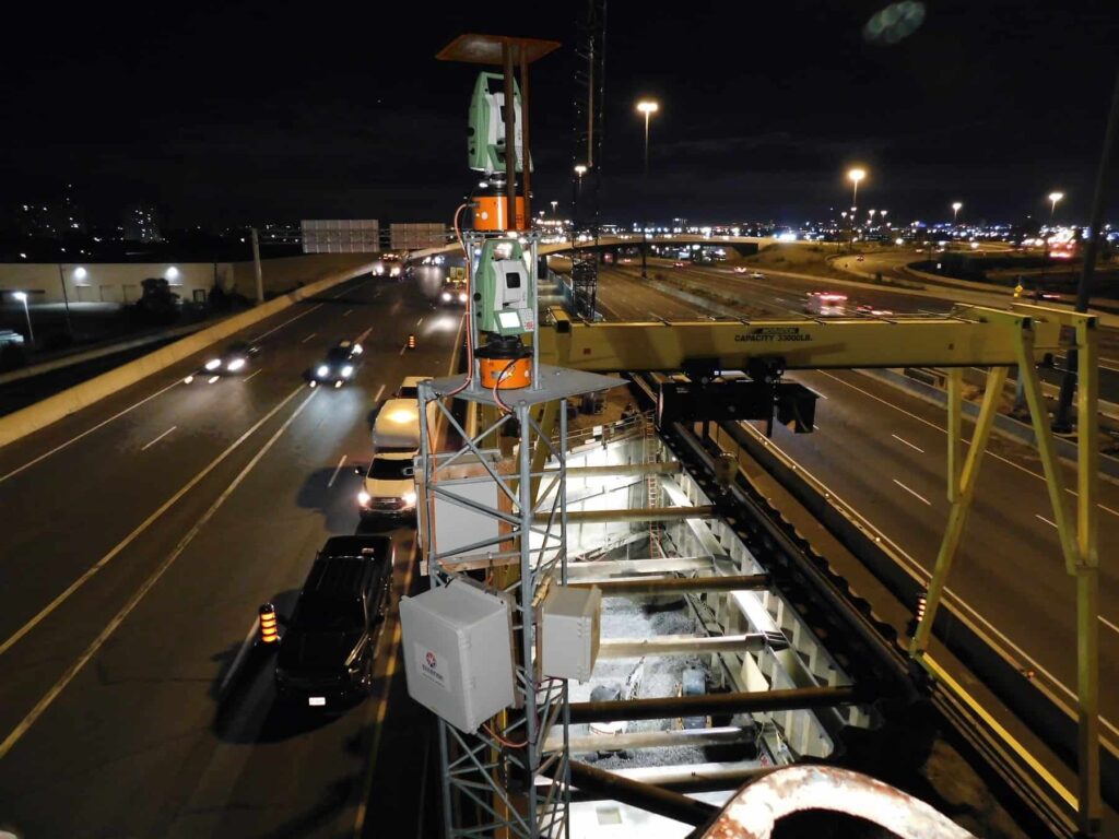 One of the challenges of this project was Sixense had to conduct their work without disrupting the continuous traffic flow on the highways above. To ensure the safety of the traveling public on the highway and rail corridors, Sixense was hired to design a monitoring system based on non-contact technologies (conventional and reflectorless robotic total stations, distance-meters), horizontal shape arrays (4D-Shape), as well as other structural and environmental instruments to monitor the deformation of the surface and the subgrade of the roadway, the rail tracks, and the subgrade of the rail corridor.