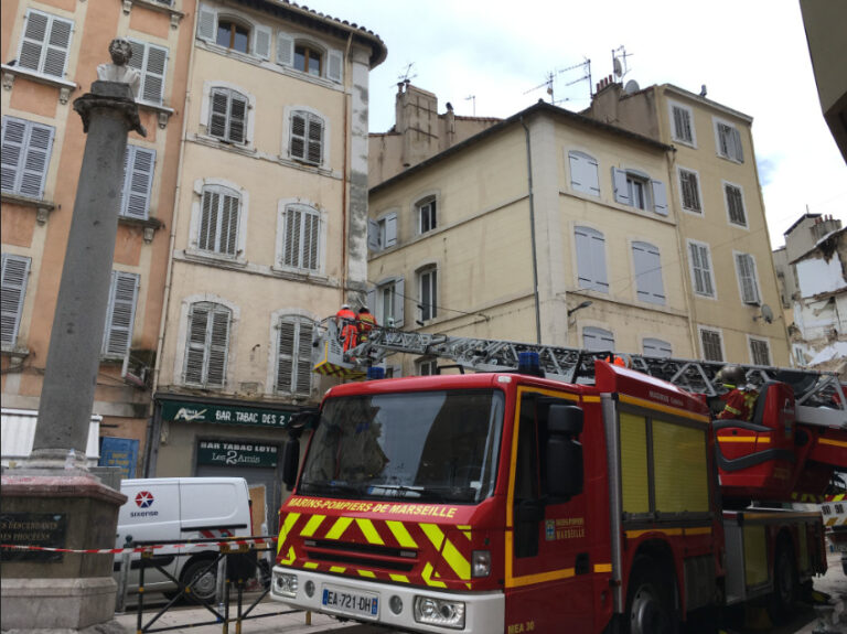 Suite à l’effondrement de trois immeubles dans le centre-ville historique de Marseille le 5 novembre 2018, la ville de Marseille évacue 30 immeubles de la rue d’Aubagne et un périmètre de sécurité est mis en place par les marins pompiers.